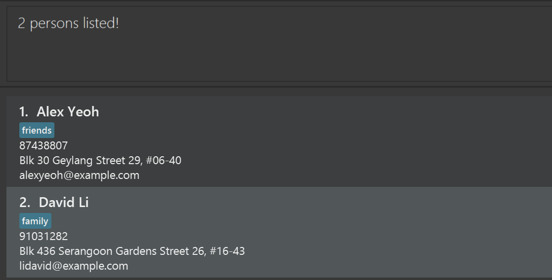 Edits the phone number and email address of the 1st person to be 91234567